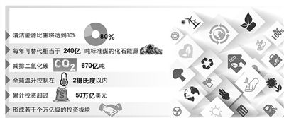 專家預(yù)測,到2050年全球能源互聯(lián)網(wǎng)初步建成時,清潔能源比重將達(dá)到80%,每年可替代相當(dāng)于240億噸標(biāo)準(zhǔn)煤的化石能源,減排二氧化碳670億噸。屆時,全球溫升控制在2攝氏度以內(nèi)的目標(biāo)有望實現(xiàn)。這一發(fā)展低碳經(jīng)濟(jì)、實現(xiàn)能源變革轉(zhuǎn)型的系統(tǒng)性解決方案,贏得潘基文、世界銀行行長金墉、美國能源部長莫尼茲等的高度贊賞和積極支持。