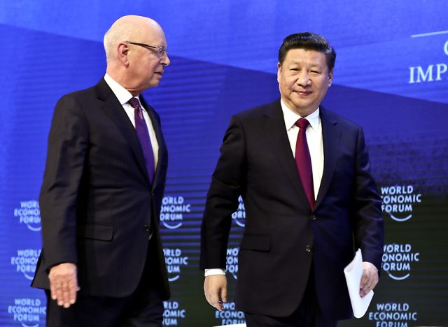 1月17日,國(guó)家主席習(xí)近平在瑞士達(dá)沃斯國(guó)際會(huì)議中心出席世界經(jīng)濟(jì)論壇2017年年會(huì)開(kāi)幕式,并發(fā)表題為《共擔(dān)時(shí)代責(zé)任 共促全球發(fā)展》的主旨演講。這是習(xí)近平同世界經(jīng)濟(jì)論壇創(chuàng)始人兼執(zhí)行主席施瓦布在一起。(新華社記者蘭紅光攝)