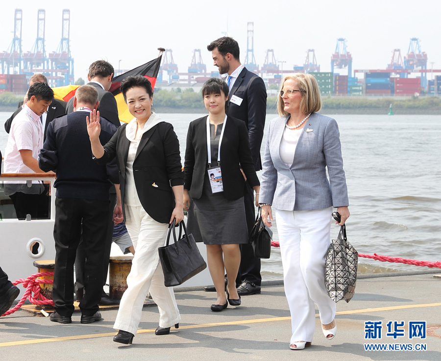 當(dāng)?shù)貢r(shí)間7月7日上午,應(yīng)德國(guó)總理默克爾丈夫紹爾邀請(qǐng),國(guó)家主席習(xí)近平夫人彭麗媛同出席二十國(guó)集團(tuán)領(lǐng)導(dǎo)人第十二次峰會(huì)的部分代表團(tuán)團(tuán)長(zhǎng)配偶乘船參觀漢堡港。新華社記者 王曄 攝