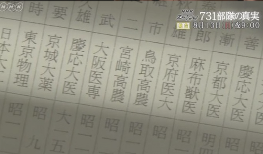 參加731部隊(duì)的機(jī)構(gòu)及人員名單(圖片來(lái)源:NHK視頻截圖)