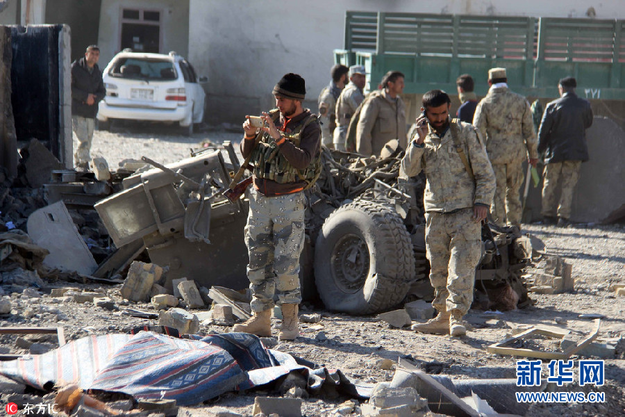當(dāng)?shù)貢r(shí)間22日,阿富汗坎大哈,當(dāng)?shù)匾惶幘炜偛吭庥鲎詺⑹狡囌◤椧u擊,造成至少6名警察死亡,4人受傷。圖為阿富汗安全官員檢查現(xiàn)場(chǎng)。(圖片來(lái)源:東方IC)