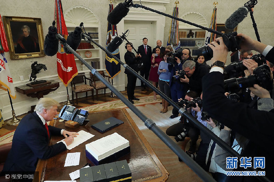 當(dāng)?shù)貢r(shí)間22日,美國(guó)華盛頓,美國(guó)總統(tǒng)特朗普在白宮的橢圓形辦公室簽署1.5萬(wàn)億美元稅改法案,此乃美國(guó)最近逾30年來(lái)最大規(guī)模減稅行動(dòng)。(圖片來(lái)源:視覺中國(guó))