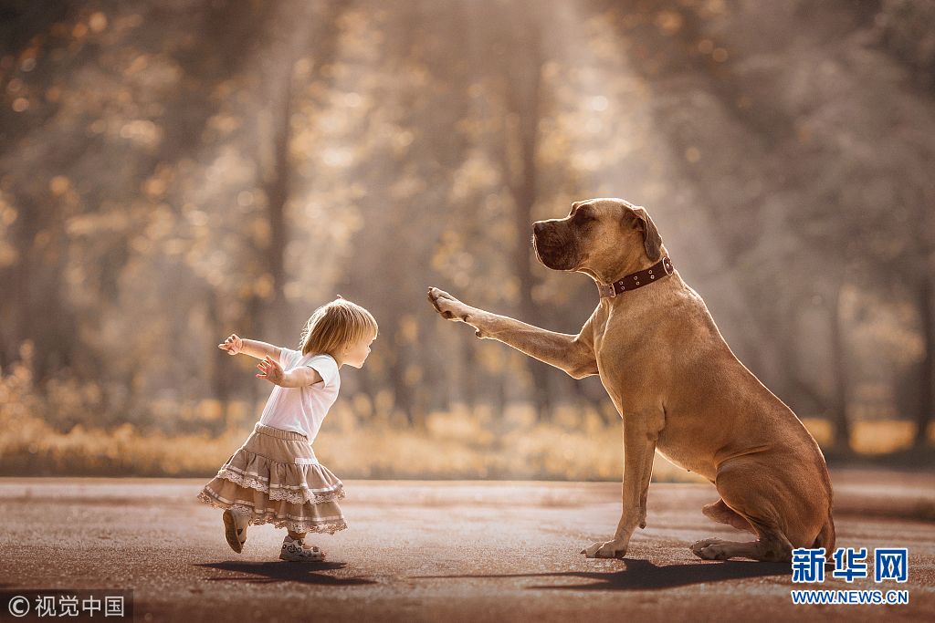 1歲零7個(gè)月的Alice和5歲大的大丹犬Sean一起玩,Sean重82公斤高達(dá)95厘米。(圖片來(lái)源:視覺(jué)中國(guó))