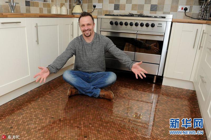 【酷!銅幣廚房】2017年2月4日,來(lái)自英國(guó)特爾福德的Matt Giles用一便士硬幣當(dāng)瓷磚,共用2.7萬(wàn)枚銅幣打造出了自己夢(mèng)寐以求的廚房地面。