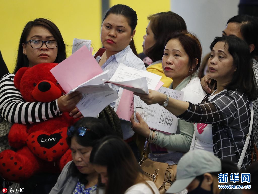 當?shù)貢r間2018年2月21日,菲律賓馬尼拉,從科威特返回的菲律賓海外勞工抵達馬尼拉國際機場。據(jù)外媒報道,宿霧太平洋航空公司為至少396名海外菲律賓工人提供空運支持,助其免費搭乘飛機回家。據(jù)悉,菲律賓政府已下令禁止民眾前往科威特務(wù)工。據(jù)悉,菲律賓總統(tǒng)杜特爾特稱,近來有在科威特打工的菲律賓女傭因不堪虐待或性侵選擇自殺。(圖片來源: 東方IC)