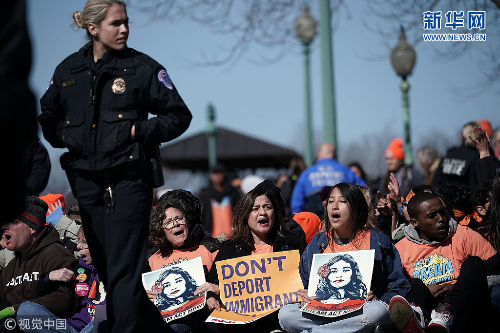 當(dāng)?shù)貢r(shí)間2018年3月5日,美國(guó)華盛頓,移民活動(dòng)家在國(guó)會(huì)山舉行集會(huì),抗議特朗普終結(jié)“夢(mèng)想法案”計(jì)劃。(圖片來(lái)源:視覺(jué)中國(guó))