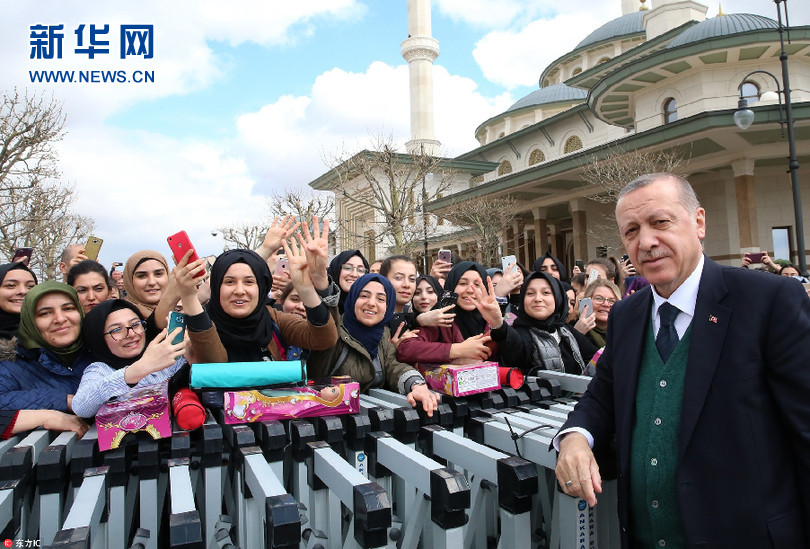 當(dāng)?shù)貢r(shí)間3月30日,土耳其安卡拉,土耳其總統(tǒng)埃爾多安在星期五禮拜結(jié)束后與民眾打招呼。(圖片來源:東方IC)