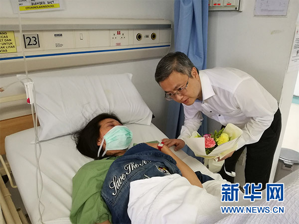 4月7日,在馬來西亞雪蘭莪州,大使館領(lǐng)保官員在醫(yī)院探望傷者。新華社發(fā)