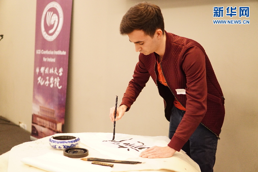 參賽者在表演中國書法。4月7日,第17屆“漢語橋”世界大學生中文比賽愛爾蘭賽區(qū)選拔賽在首都都柏林舉行。新華網(wǎng)發(fā)
