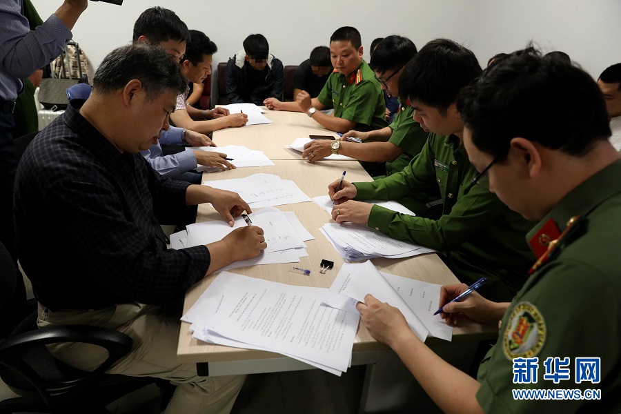 4月28日,中越警方簽署移交相關(guān)文件。當日,越南警方在河內(nèi)內(nèi)排國際機場向中國警方工作組移交了許某等8名涉嫌詐騙罪的在逃嫌疑人。中國警方“獵狐行動”在越南再獲新成果。新華社記者王迪攝