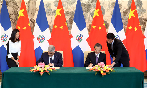 2018年5月1日上午,國務(wù)委員兼外交部長王毅在北京同多米尼加外長巴爾加斯簽署兩國關(guān)于建立外交關(guān)系的聯(lián)合公報。