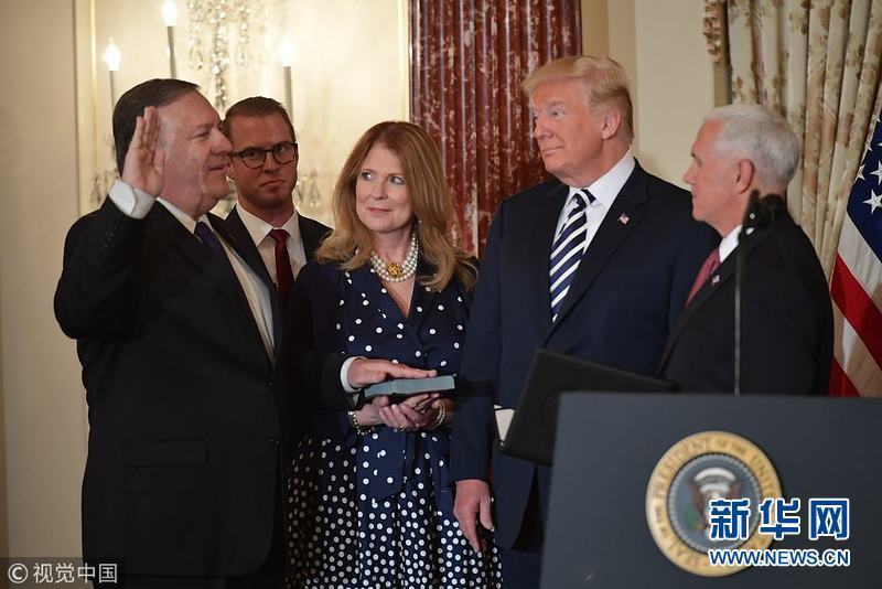 資料圖:5月2日,美國華盛頓,邁克·蓬佩奧在總統(tǒng)特朗普的見證下正式宣誓就職美國國務(wù)卿。新華網(wǎng)發(fā)