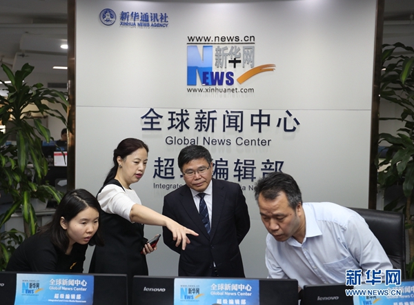 5月16日,外交部拉美司司長趙本堂(左三)接受了新華網(wǎng)獨(dú)家專訪。圖為新華網(wǎng)副總編輯劉娟(左二)介紹新華網(wǎng)情況。新華網(wǎng)記者 郭小天攝