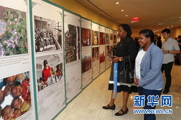 6月28日,在位于紐約的聯(lián)合國總部,人們觀看“追尋美好生活”中國脫貧成就展。 新華社記者李木子攝