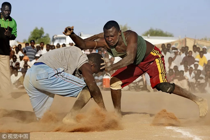 蘇丹喀土穆居民在烈日下舉行摔跤比賽。