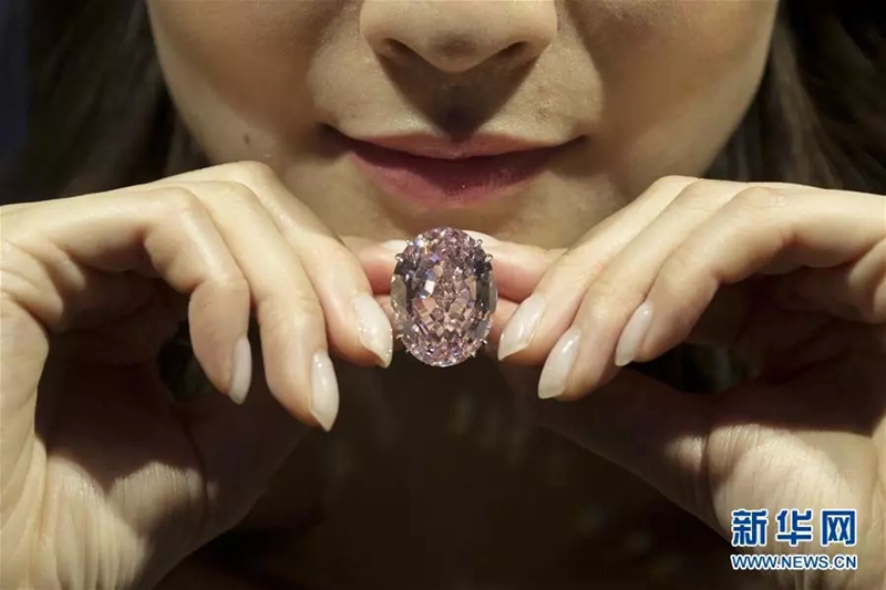 在中國(guó)香港蘇富比拍賣行,模特展示“粉紅之星”鉆石。新華社/歐新