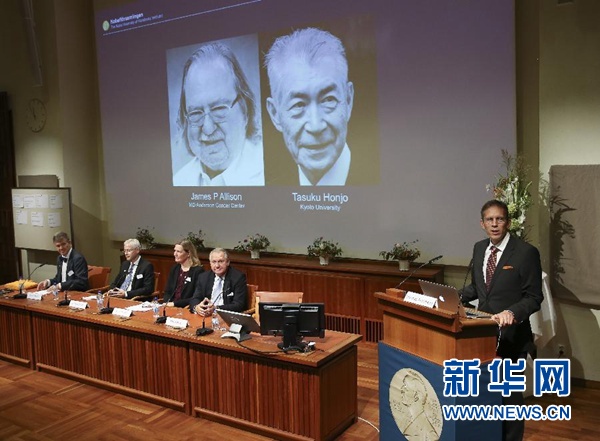 瑞典卡羅琳醫(yī)學(xué)院10月1日宣布,將2018年諾貝爾生理學(xué)或醫(yī)學(xué)獎(jiǎng)授予美國科學(xué)家詹姆斯·艾利森和日本科學(xué)家本庶佑,以表彰他們?cè)诎┌Y免疫治療方面所作出的貢獻(xiàn)。 這是10月1日在瑞典斯德哥爾摩卡羅琳醫(yī)學(xué)院拍攝的諾貝爾生理學(xué)或醫(yī)學(xué)獎(jiǎng)評(píng)選委員會(huì)新聞發(fā)布會(huì)現(xiàn)場(chǎng)。 新華社記者葉平凡攝