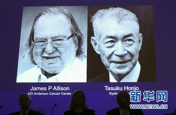 10月1日,在瑞典斯德哥爾摩卡羅琳醫(yī)學(xué)院舉行的新聞發(fā)布會(huì)現(xiàn)場(chǎng),大屏幕顯示美國科學(xué)家詹姆斯·艾利森(左)和日本科學(xué)家本庶佑的照片。 新華社記者葉平凡攝