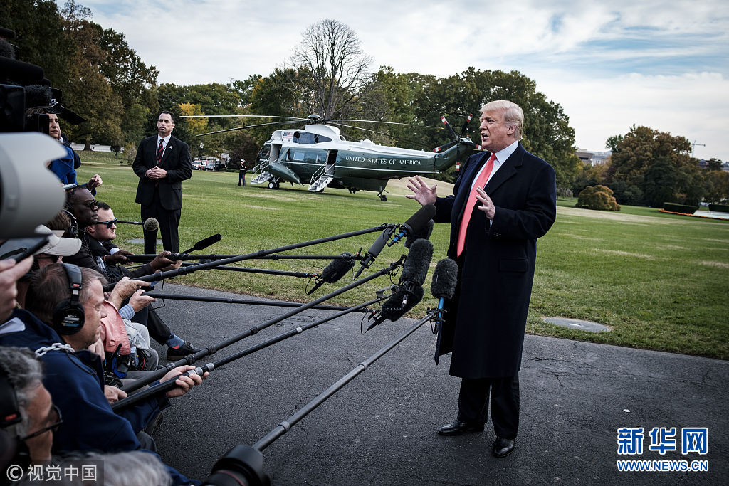 當(dāng)?shù)貢r(shí)間2018年10月31日,美國(guó)華盛頓,美國(guó)總統(tǒng)特朗普啟程前往佛羅里達(dá)州出席競(jìng)選集會(huì),在白宮南草坪發(fā)表講話。特朗普稱,計(jì)劃部署在美墨邊境的現(xiàn)役軍人數(shù)量或增加至15000人,以嚴(yán)防來勢(shì)洶洶的“大篷車”移民。(圖片來源:視覺中國(guó))