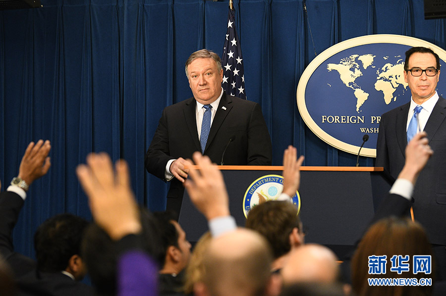 11月5日,在美國首都華盛頓,美國國務(wù)卿蓬佩奧(后左)和財(cái)政部長姆努欽(后右)出席記者會(huì)。 新華社記者劉杰攝