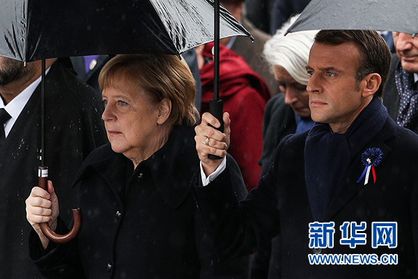 11月11日,法國總統(tǒng)馬克龍(右)與德國總理默克爾從法國巴黎的香榭麗舍大街走向凱旋門,參加一戰(zhàn)結(jié)束百年紀念儀式。新華社記者 鄭煥松 攝