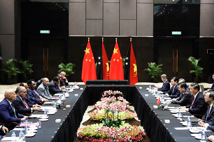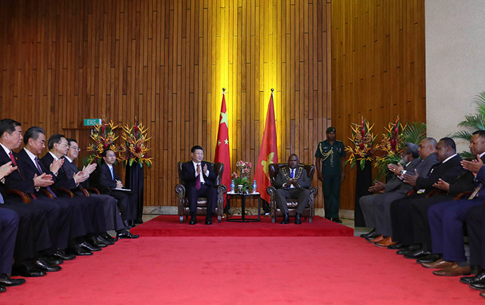 11月16日,國(guó)家主席習(xí)近平在莫爾茲比港分別會(huì)見(jiàn)建交太平洋島國(guó)領(lǐng)導(dǎo)人。這是習(xí)近平會(huì)見(jiàn)紐??偫硭P氯A社記者 丁林 攝
