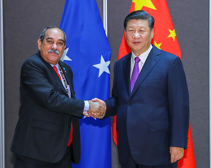 11月16日,國(guó)家主席習(xí)近平在莫爾茲比港分別會(huì)見(jiàn)建交太平洋島國(guó)領(lǐng)導(dǎo)人。這是習(xí)近平會(huì)見(jiàn)庫(kù)克群島總理普納。新華社記者 丁林 攝