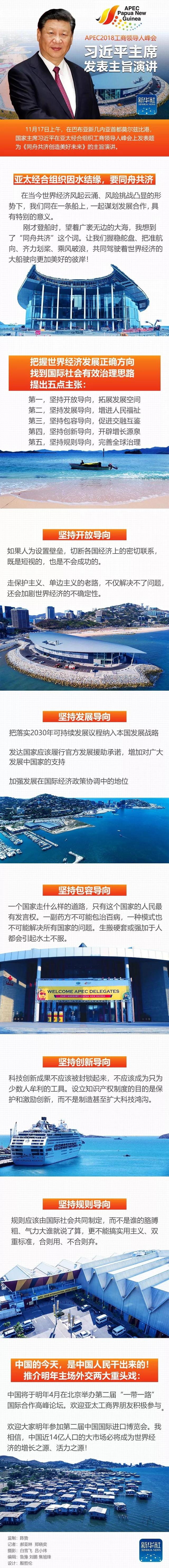 11月17日上午,在巴布亞新幾內(nèi)亞首都莫爾茲比港,國家主席習近平在亞太經(jīng)合組織工商領(lǐng)導(dǎo)人峰會上發(fā)表題為《同舟共濟創(chuàng)造美好未來》的主旨演講。