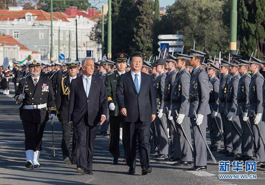 在前往總統(tǒng)府途中,葡萄牙國(guó)民衛(wèi)隊(duì)騎兵儀仗隊(duì)隨行護(hù)送。抵達(dá)時(shí),德索薩在停車處再次迎接,禮兵在沿途兩側(cè)列隊(duì),小號(hào)手吹號(hào)致敬。習(xí)近平與葡方陪同人員握手,德索薩與中方陪同人員握手。