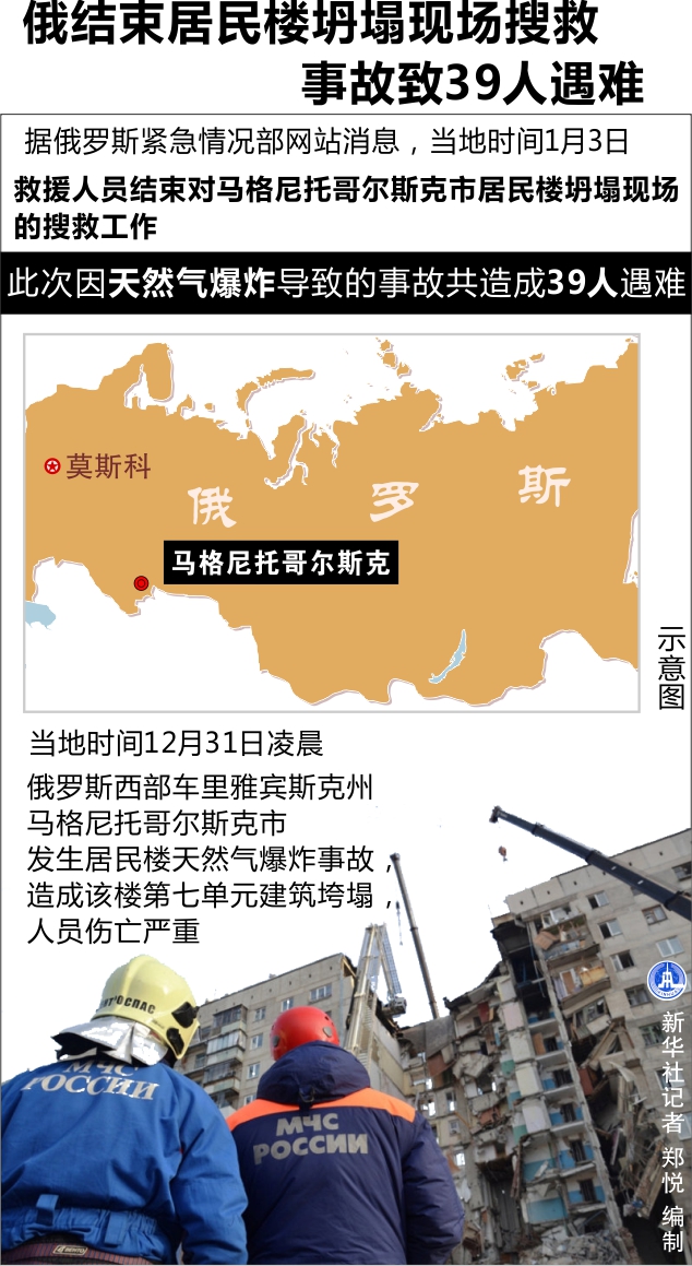 新華社莫斯科1月3日電(記者欒海)據(jù)俄羅斯緊急情況部網(wǎng)站消息,救援人員3日結(jié)束對馬格尼托哥爾斯克市居民樓坍塌現(xiàn)場的搜救工作,此次因天然氣爆炸導(dǎo)致的事故共造成39人遇難。