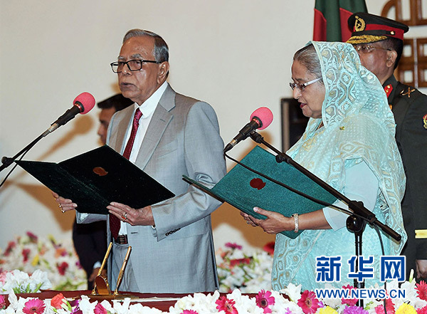 1月7日,在孟加拉國首都達卡,孟加拉國總統(tǒng)哈米德(左)與總理哈西娜(右)出席新內(nèi)閣宣誓就職儀式。新華社發(fā)