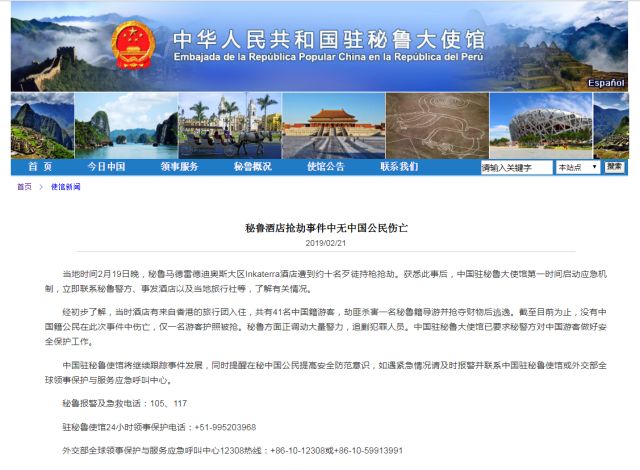 駐秘魯使館24小時領(lǐng)事保護電話:+51-995203968