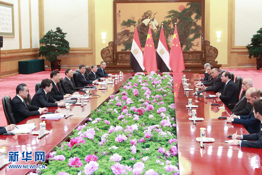 習(xí)近平強(qiáng)調(diào),埃及是非洲聯(lián)盟輪值主席國,總統(tǒng)先生來華出席第二屆“一帶一路”國際合作高峰論壇,不僅體現(xiàn)了埃及積極參與共建“一帶一路”的真誠意愿,也代表著非洲國家尋求互利共贏、實現(xiàn)共同發(fā)展的普遍呼聲。中方高度重視發(fā)展同埃及關(guān)系。雙方要深化政治互信,繼續(xù)在涉及彼此核心利益和重大關(guān)切問題上相互支持和配合。中方始終支持埃及探索符合本國國情的發(fā)展道路,愿積極參與蘇伊士運(yùn)河走廊開發(fā)計劃,持續(xù)推進(jìn)蘇伊士經(jīng)貿(mào)合作區(qū)建設(shè)及產(chǎn)能、基礎(chǔ)設(shè)施建設(shè)等領(lǐng)域合作。中方還將在埃及設(shè)立“魯班工坊”,向埃及青年提供職業(yè)技能培訓(xùn)。雙方要深化反恐和安全合作,持續(xù)密切人文交流。中國感謝非洲人民對中國的信任,我們支持非洲和平安全與可持續(xù)發(fā)展倡議和非洲一體化進(jìn)程,愿同埃方加強(qiáng)對非三方合作,共同促進(jìn)非洲基礎(chǔ)設(shè)施建設(shè)。