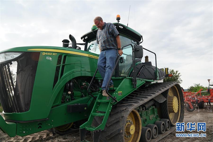 6月9日,在位于美國中部密蘇里州的小鎮(zhèn)奧里克,湯姆·沃特斯從一輛拖拉機上下來。新華社記者 劉杰 攝