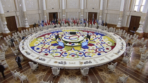 15日上午,杜尚別納烏魯茲宮,習(xí)主席出席亞洲相互協(xié)作與信任措施會(huì)議第五次峰會(huì)。圓桌會(huì)議開(kāi)始后,亞信主席國(guó)元首拉赫蒙總統(tǒng)邀請(qǐng)習(xí)主席第一個(gè)發(fā)言。