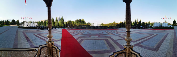 儀仗隊(duì)在塔吉克斯坦總統(tǒng)府列隊(duì),等候兩國(guó)元首檢閱。遠(yuǎn)處高聳的旗桿位于總統(tǒng)府外的國(guó)旗公園,高165米,是杜尚別的地標(biāo)建筑之一。新華社記者 霍小光 攝