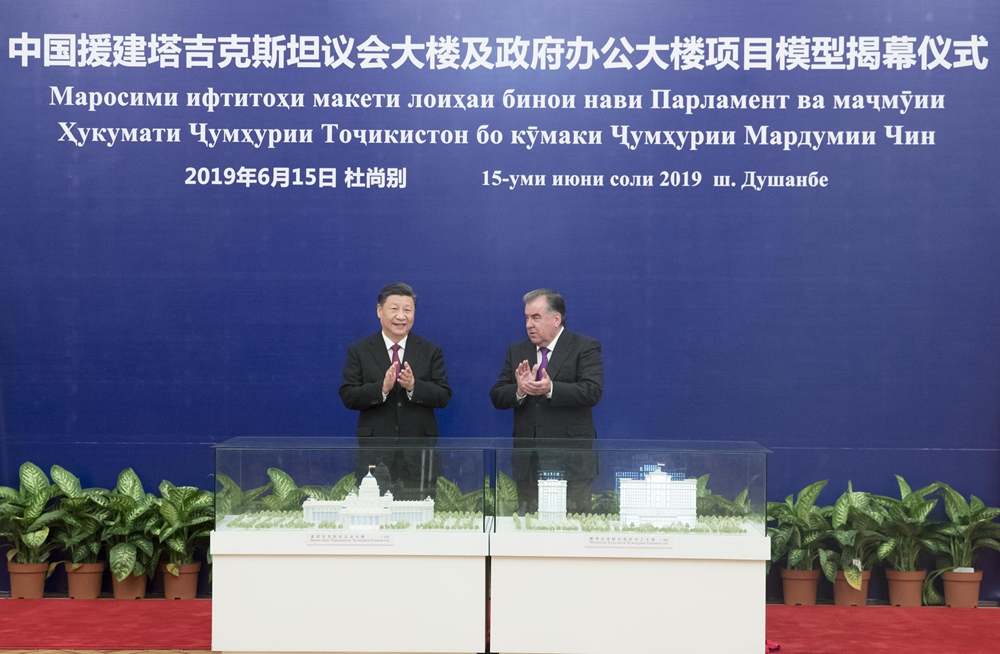 6月15日,國(guó)家主席習(xí)近平在杜尚別同塔吉克斯坦總統(tǒng)拉赫蒙會(huì)談。會(huì)談后,兩國(guó)元首共同出席中方援塔議會(huì)大樓、政府辦公大樓項(xiàng)目模型揭幕儀式。新華社記者 王曄 攝