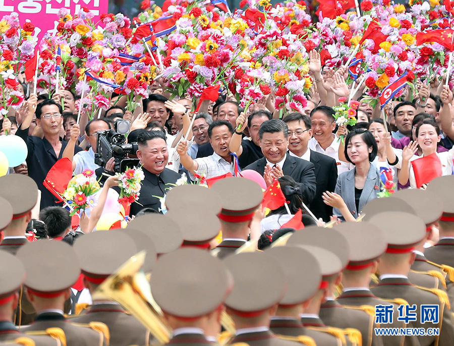 習(xí)近平抵達(dá)黎明大街路口,換乘敞篷車,與金正恩同車前往錦繡山太陽宮廣場。街道兩旁,人山人海,盛況空前。歡迎民眾站在高坡上,從住宅樓的窗臺上,向中國貴賓歡呼致敬。到處都是熱情的笑臉,友好的歡呼聲不絕于耳。習(xí)近平和金正恩向歡迎的人群頻頻揮手致意。