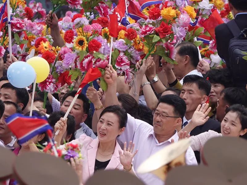 到處都是熱情的笑臉,友好的歡呼聲不絕于耳。習(xí)近平和金正恩向歡迎的人群頻頻揮手致意。