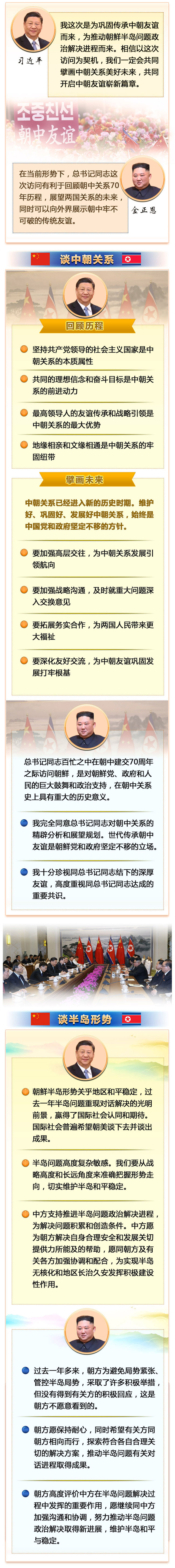 習(xí)近平指出,去年以來(lái),我和委員長(zhǎng)同志4次會(huì)晤,書(shū)寫(xiě)了中朝關(guān)系新篇章,并結(jié)下了深厚友誼。感謝金正恩委員長(zhǎng)同志為我這次訪問(wèn)舉行的隆重而熱烈的歡迎儀式,我今天從下飛機(jī)到抵達(dá)住處,所到之處無(wú)不感受到中朝一家親的濃厚氛圍。今年是中朝建交70周年,在兩黨兩國(guó)關(guān)系發(fā)展史上具有承前啟后、繼往開(kāi)來(lái)的重要意義,我又同金正恩委員長(zhǎng)在平壤會(huì)面。我這次是為鞏固傳承中朝友誼而來(lái),為推動(dòng)朝鮮半島問(wèn)題政治解決進(jìn)程而來(lái)。相信以這次訪問(wèn)為契機(jī),我們一定會(huì)共同擘畫(huà)中朝關(guān)系美好未來(lái),共同開(kāi)啟中朝友誼嶄新篇章。