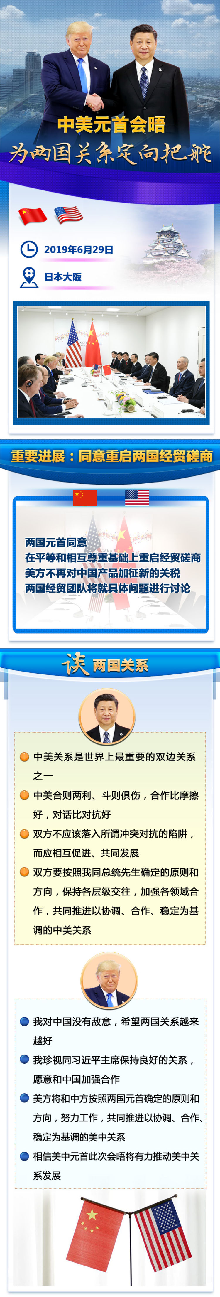 舉世矚目的中美元首會晤,于6月29日在日本大阪舉行。國家主席習近平同美國總統(tǒng)特朗普就事關中美關系發(fā)展的根本性問題、當前中美經(jīng)貿摩擦以及共同關心的國際和地區(qū)問題深入交換意見,為下階段兩國關系發(fā)展定向把舵,同意推進以協(xié)調、合作、穩(wěn)定為基調的中美關系。