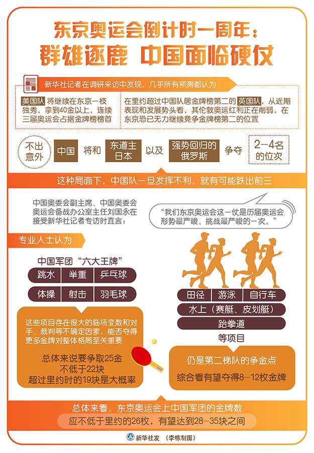 美國一家獨大、日本雄心勃勃、俄羅斯勵精圖治、英國余威仍在,五強(qiáng)逐鹿東京的格局下,中國奧運軍團(tuán)如逆水行舟,進(jìn)可與日俄上演“爭二”大戰(zhàn);稍有不慎,也可能跌出金牌榜前三。
