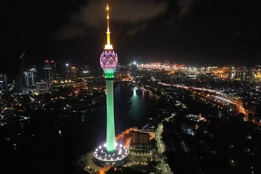 斯里蘭卡首都科倫坡地標(biāo)建筑蓮花電視塔9月16日晚舉行竣工慶典??苽惼律徎娨曀侵兴箖蓢凇耙粠б宦贰苯ㄔO(shè)中的重要合作項目。新華社發(fā)