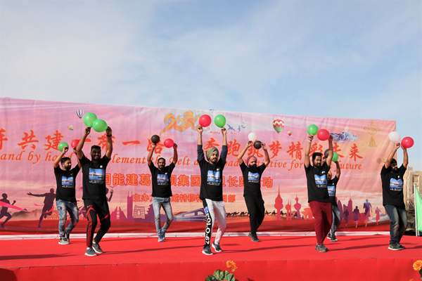 1月1日,在科威特杰赫拉省,葛洲壩集團(tuán)外國(guó)員工在長(zhǎng)跑活動(dòng)開(kāi)幕式上表演舞蹈。聶云鵬攝