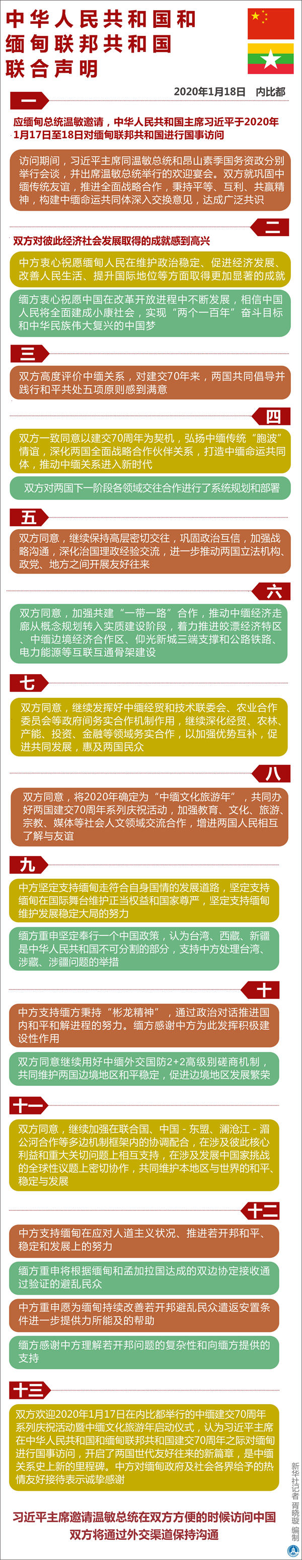 十三、雙方歡迎2020年1月17日在內(nèi)比都舉行的中緬建交70周年系列慶祝活動暨中緬文化旅游年啟動儀式,認(rèn)為習(xí)近平主席在中華人民共和國和緬甸聯(lián)邦共和國建交70周年之際對緬甸進(jìn)行國事訪問,開啟了兩國世代友好往來的新篇章,是中緬關(guān)系史上新的里程碑。中方對緬甸政府及社會各界給予的熱情友好接待表示誠摯感謝。