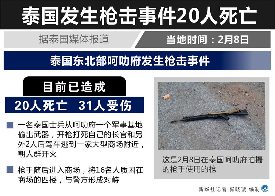 泰國(guó)媒體8日援引泰國(guó)國(guó)防部發(fā)言人空奇的話報(bào)道說(shuō),此次槍擊事件已造成20人死亡。另?yè)?jù)媒體報(bào)道,槍擊事件的傷者已達(dá)31人。