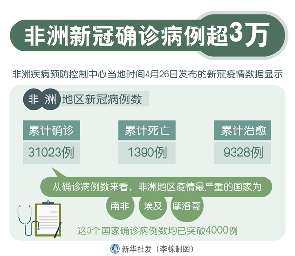 新華社達累斯薩拉姆4月26日電 綜合新華社駐非洲地區(qū)記者報道:非洲疾病預防控制中心26日發(fā)布的新冠疫情數(shù)據(jù)顯示,非洲地區(qū)新冠累計確診病例數(shù)為31023例,累計死亡1390例,累計治愈9328例。為支持非洲各國抗擊新冠疫情,聯(lián)合國推出信息平臺協(xié)助抗疫。