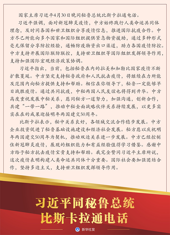 習(xí)近平指出,當(dāng)前,包括秘魯在內(nèi)的拉美和加勒比國家疫情不斷擴(kuò)散蔓延。中方堅(jiān)定支持秘魯政府和人民抗擊疫情,將繼續(xù)在力所能及范圍內(nèi)向秘方提供支持和幫助。相信在你領(lǐng)導(dǎo)下,秘魯一定能夠早日戰(zhàn)勝疫情。通過共同抗疫,中秘兩國人民友誼也將得到升華。中方高度重視發(fā)展中秘關(guān)系,愿同秘方一道努力,加強(qiáng)溝通,創(chuàng)新合作,共建“一帶一路”,推動中秘全面戰(zhàn)略伙伴關(guān)系持續(xù)發(fā)展,以更多實(shí)實(shí)在在的成果迎接明年兩國建交50周年。
