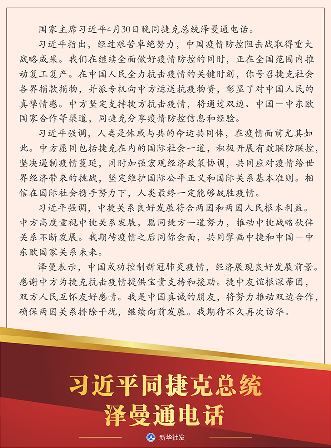 習近平指出,經(jīng)過艱苦卓絕努力,中國疫情防控阻擊戰(zhàn)取得重大戰(zhàn)略成果。我們在繼續(xù)全面做好疫情防控的同時,正在全國范圍內(nèi)推動復(fù)工復(fù)產(chǎn)。在中國人民全力抗擊疫情的關(guān)鍵時刻,你號召捷克社會各界捐款捐物,并派專機向中方運送抗疫物資,彰顯了對中國人民的真摯情感。中方堅定支持捷方抗擊疫情,將通過雙邊、中國-中東歐國家合作等渠道,同捷克分享疫情防控信息和經(jīng)驗。
