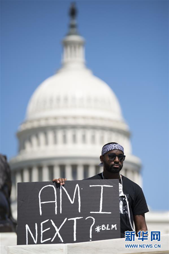 5月30日,在美國首都華盛頓國會(huì)山附近,一名男子手持標(biāo)語參加抗議活動(dòng)。 新華社記者 劉杰 攝